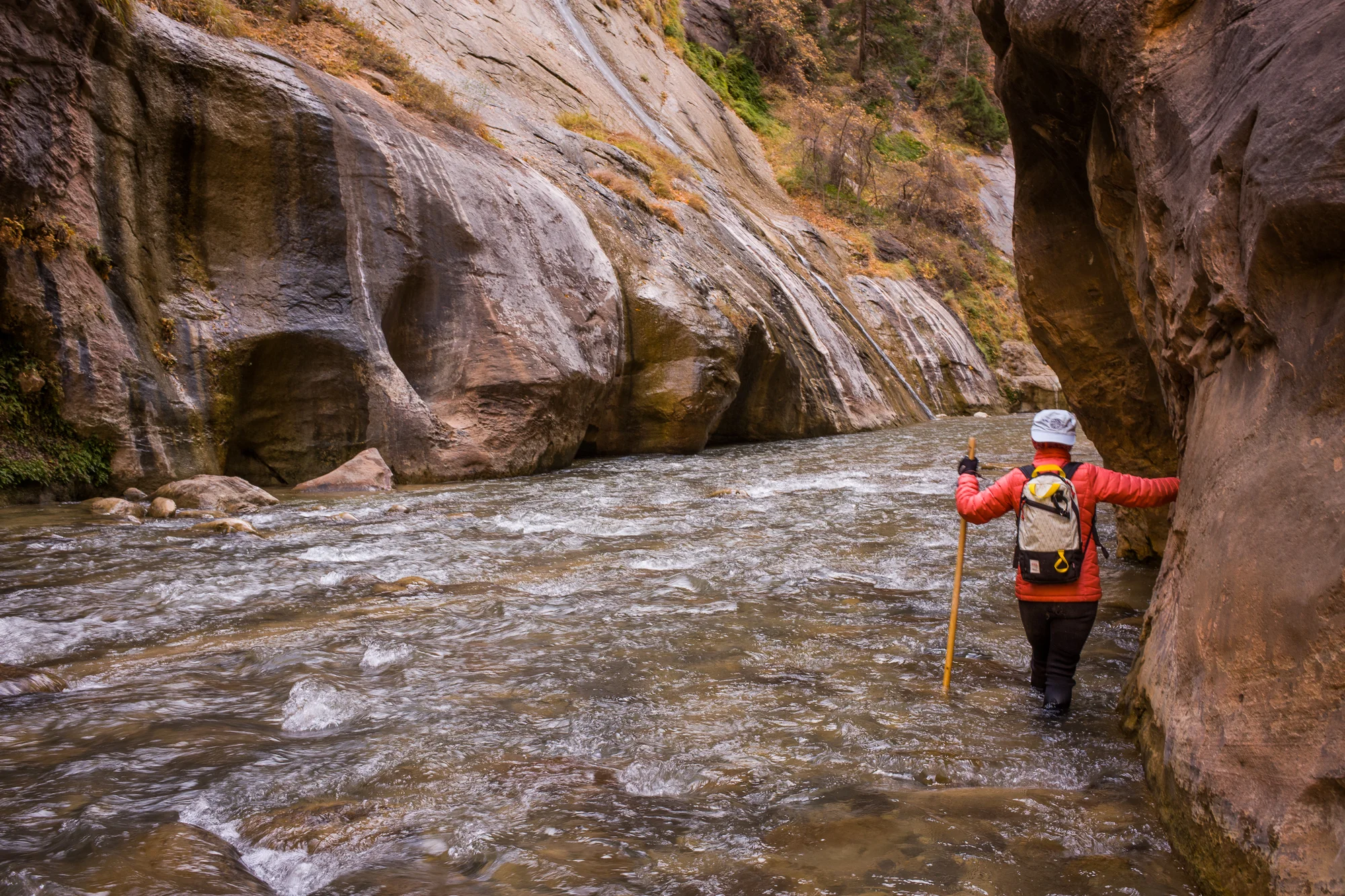 Many end up where The Narrows begins but most don't descend into the water. Entering the chilly river, you might experience the rush of new adventure emotions. Your ears fill with the echoing sounds of flowing water as you scan the sky through the narrow slit of stone. If you feel like you are walking inside the earth, it is because you are! Look down river and you see multicolored stones through a changing lens of running water. If you stare too long, the stones appear to move with the water and you might hesitate where to place your next step. To break the spell, don't look down. Instead, feel the river bottom with your feet and wooden stick. Keep your gaze ahead and observe the flow as some parts are deeper and quicker than others. As you continue, stop from time to time, and notice how others navigate the changing landscape. Adjust and always keep an eye on water currents that can be easily avoided. Plan your route through the river so you get to the next patch of dry land. Regroup. Soak in this rare experience. After 15 minutes in the river, time magically stops. You are on a solitary journey inside a slice of earth. As you round the bend, civilization is a memory. You are in a magical place. Is this what the Anasazi felt walking this canyon 1000 years ago? When the time is right, make your way back to your starting point. Tip - Conditions partially determine the logistics of changing into and out of your gear and is best discussed with your provisioner on the day of your adventure.